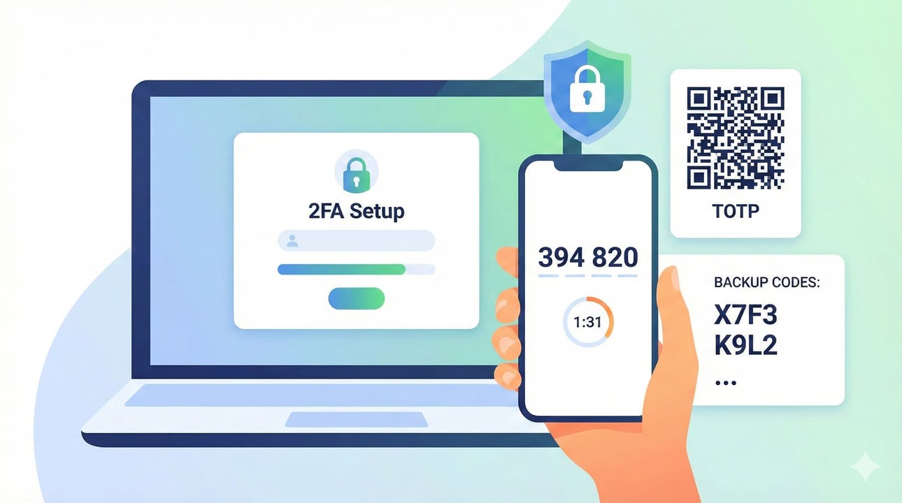 user.twofa_enabledเป็น booleanuser.twofa_secret_encเป็น secret ที่เข้ารหัสแล้วbackup_codes: user_id, code_hash, used_at, created_atsecurity_events: user_id, event_type, ip, ua, created_at
