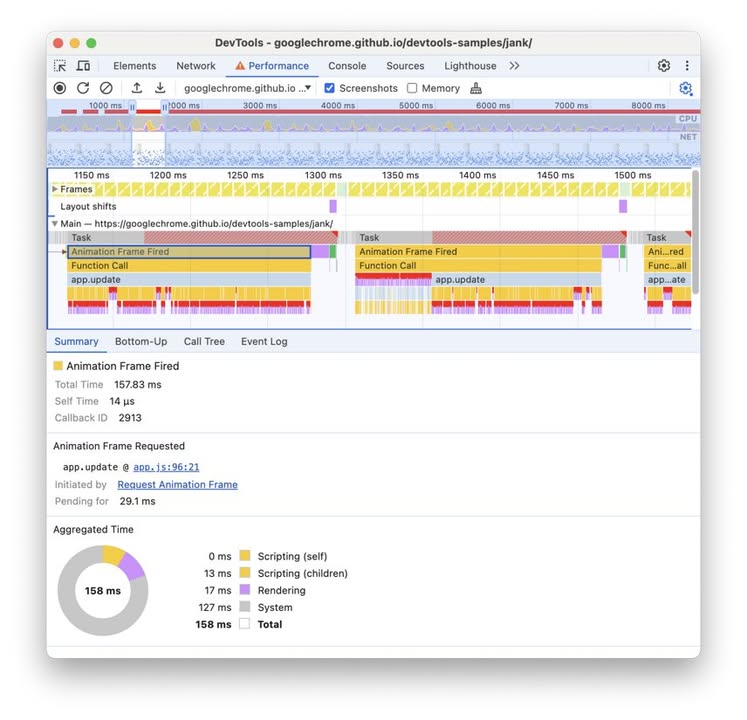 ให้ซูมไปยังช่วงเวลาที่ผู้ใช้รู้สึกว่าช้า เช่น ตอนคลิกปุ่ม หรือช่วงที่หน้าเว็บเพิ่งแสดงผล แล้วเปิดดู Call tree หรือ Bottom-up เพื่อหา function ที่ใช้เวลามากที่สุด
