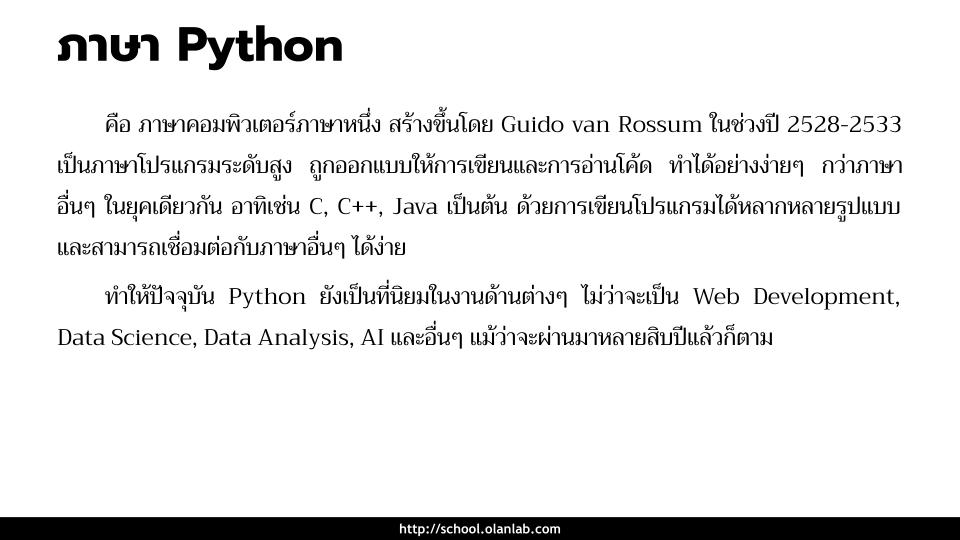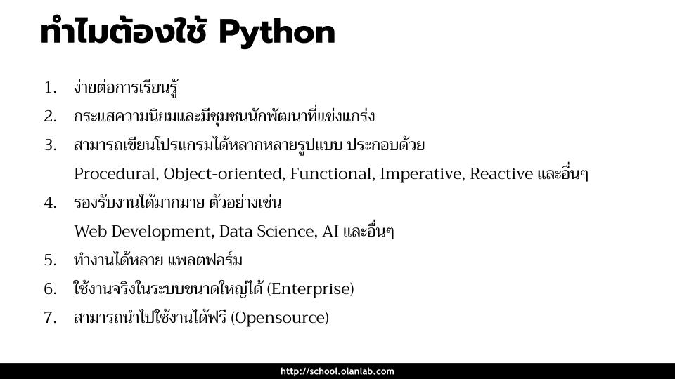 Python เป็นภาษาโปรแกรมมิ่งภาษาหนึ่งที่นิยมอย่างมากทั่วโลกในยุคนี้ ถูกเลือกขึ้นมาสอนเป็นภาษาแรกทั้งในโรงเรียน และ มหาวิทยาลัย เพราะโครงสร้างภาษาถูกออกแบบมาให้เขียนและอ่านที่ง่ายกว่าภาษาอื่นๆ รวมถึงการเขียนโปรแกรมได้หลากหลายรูปแบบและสามารถเชื่อมต่อกับภาษาอื่นๆ ได้ง่าย นอกจากความง่ายของตัวภาษาแล้ว